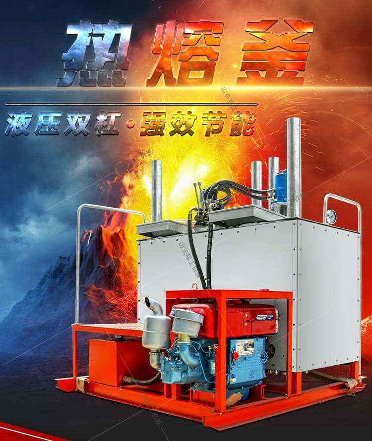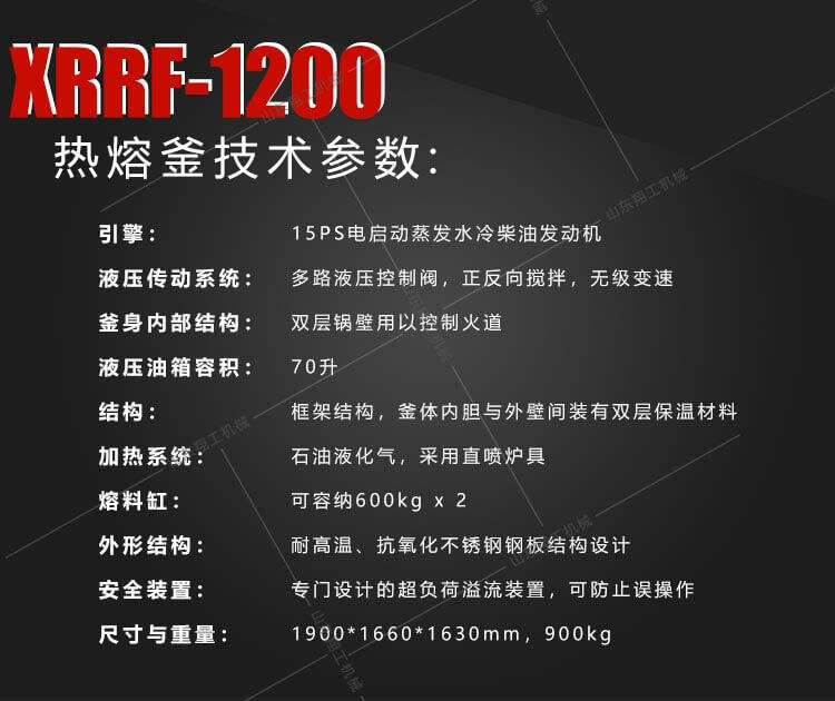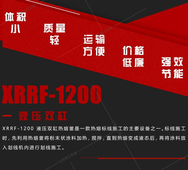 XG1200液壓雙缸熱熔釜是一款熱熔標線施工的主要設(shè)備之一。標線施工時,先利用熱熔釜將粉末狀涂料加熱,攪拌,直到熱熔變成液態(tài)后,再將涂料放入劃線機內(nèi)進行劃線施工。