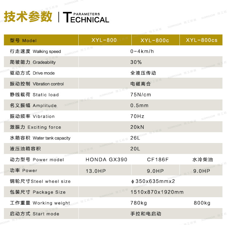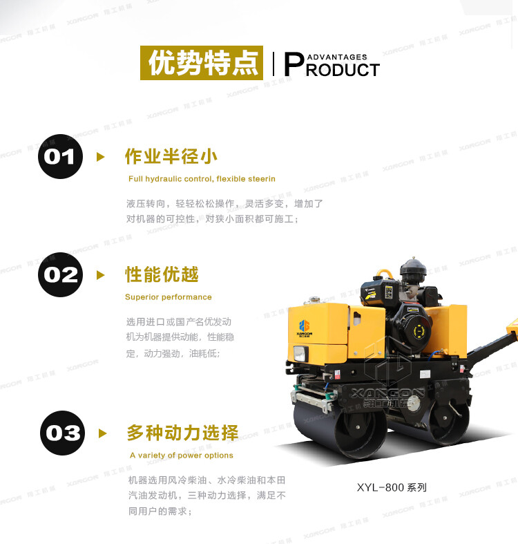 XYL-800C手扶全液壓壓路機(柴油)主要用于溝渠基礎,道路,體育場地的壓實整平,也可用于壓實瀝青表面的作業(yè)。