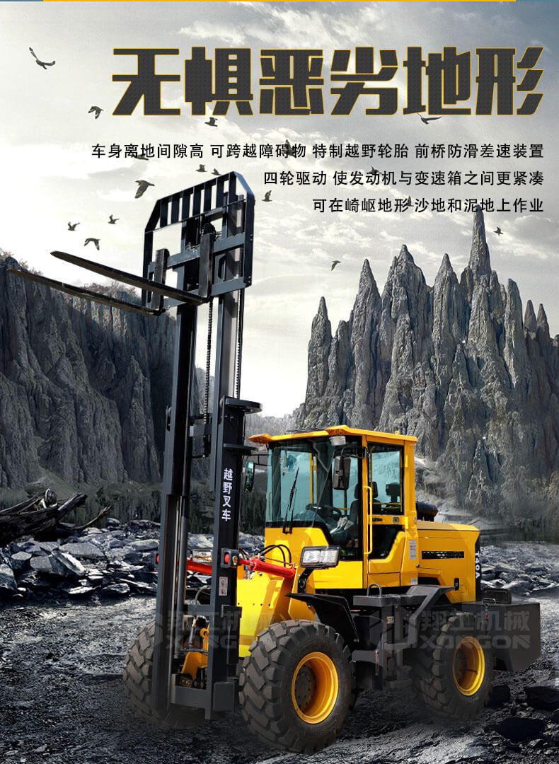 3.普通叉車只能在平整的路面上作業(yè),而越野叉車既可以在普通路面上作業(yè),還可以在山路泥路崎嶇道路作業(yè),輪胎抓地力強(qiáng),不打滑。