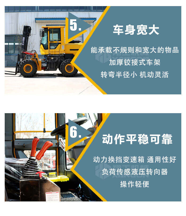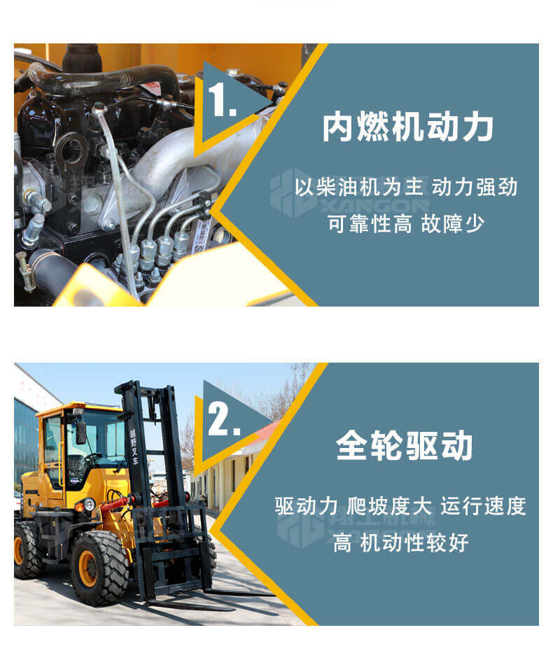 5.越野叉車發(fā)動(dòng)機(jī)功率大,采用全輪驅(qū)動(dòng)和越野輪胎。