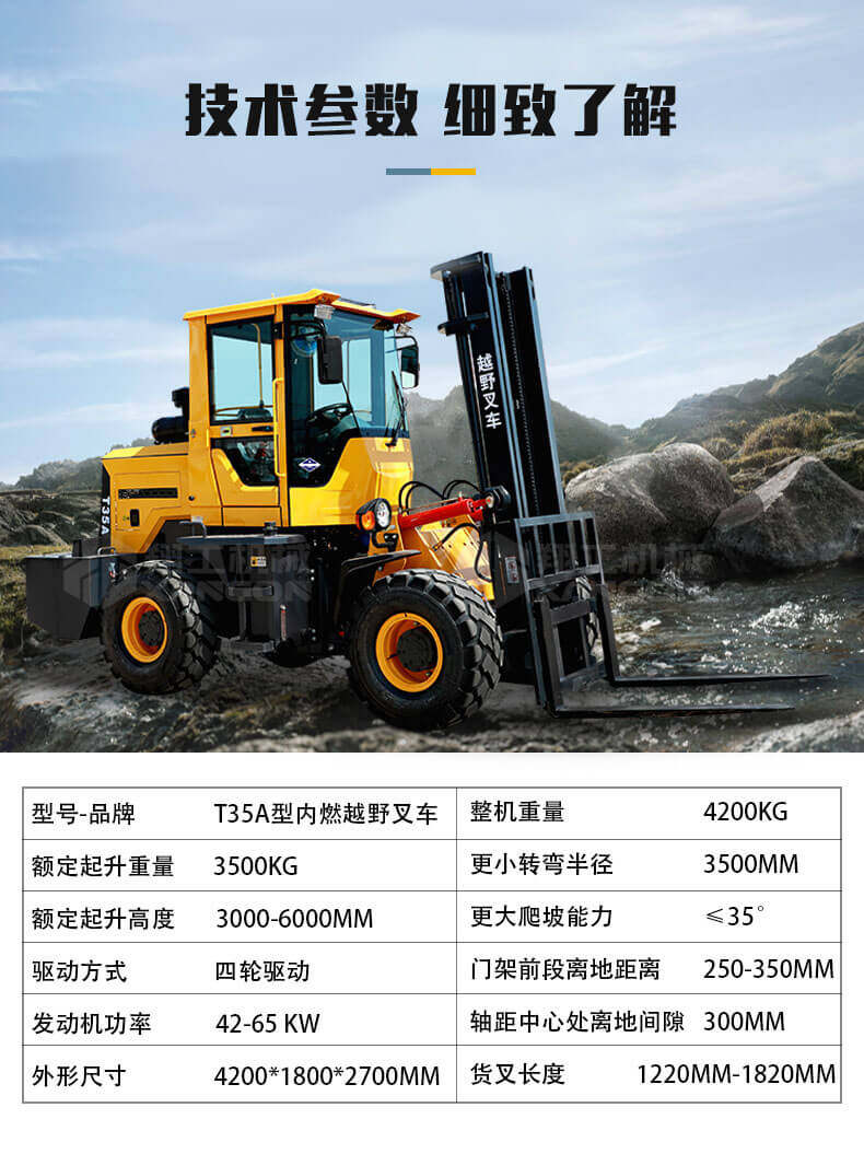 T35A型內(nèi)燃越野叉車可以在坡地和不平地面上進(jìn)行貨物裝、卸、堆垛及搬運(yùn)作業(yè),具有良好的機(jī)動(dòng)性、越野性可靠性。其功能多樣,可搭配側(cè)移器、調(diào)距叉、旋轉(zhuǎn)器、軟包夾、推出器、側(cè)翻叉、側(cè)翻斗、起重臂等工具完成不同的工作。