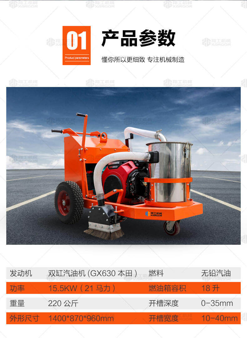 自吸塵式路面開槽機帶有吸塵功能,解決了傳統(tǒng)開槽機工作產生灰塵的問題,更加環(huán)保。我們這款路面開槽機是專門用于混凝土路面開槽的,性能優(yōu)越,節(jié)能環(huán)保。