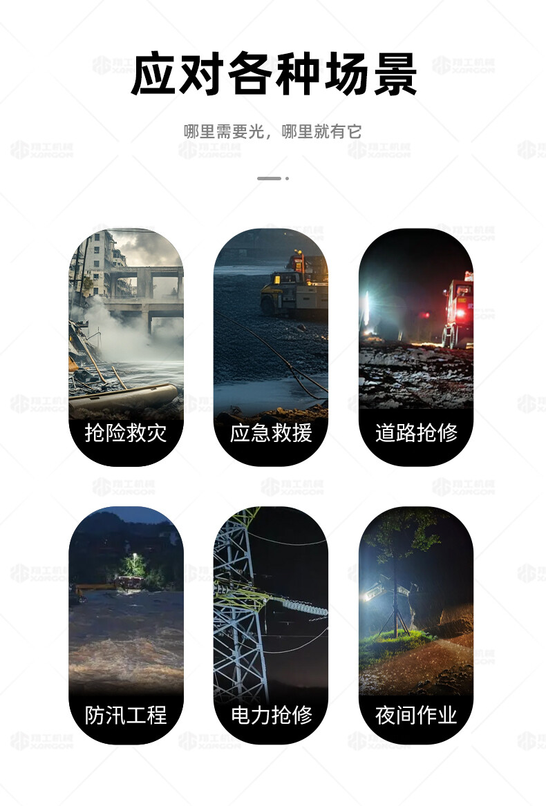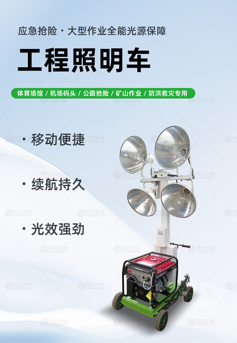 工程照明車XZM-1000B用于體育場(chǎng)館、機(jī)場(chǎng)、碼頭等大型公共場(chǎng)所,公路、鐵路、電力等緊急搶險(xiǎn)現(xiàn)場(chǎng),露天采礦現(xiàn)場(chǎng),以及防洪防汛、搶險(xiǎn)救災(zāi)現(xiàn)場(chǎng)等其它需要緊急備用光源、電源的場(chǎng)合