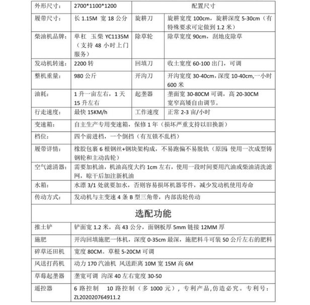 田園管理機是一種多功能小型農(nóng)田作業(yè)機械。該機具有重量輕、功能多的特點,主要作業(yè)項目有深旋、噴藥、復土、鋤草、中耕、開溝、起壟、破碎、運輸、起壟覆膜、根莖收獲等。
