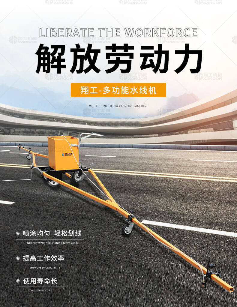 水線車是標(biāo)線施工前序工作中施劃水線放樣的專用設(shè)備。 水線是標(biāo)線施工前必不可少的工序,水線機(jī)可以替代大部分的手工放樣,降低勞動強(qiáng)度,提高工作效率,省時省力。 本產(chǎn)品可同時劃三條基準(zhǔn)線(水線),可靈活調(diào)整水線間距;水線架和伸縮桿可折疊、拆卸,便宜運(yùn)輸。 在施工前,在所要施劃標(biāo)線的位置上需先涂劃水線,用以引導(dǎo)標(biāo)線劃線機(jī)的施劃。