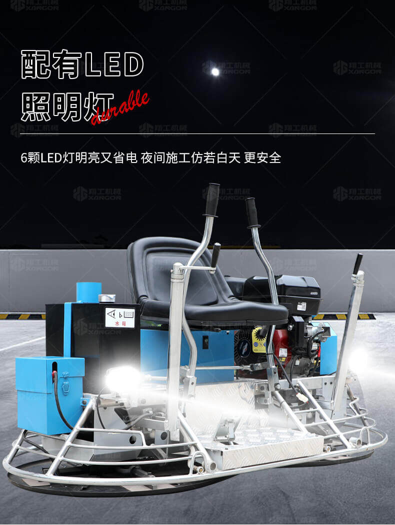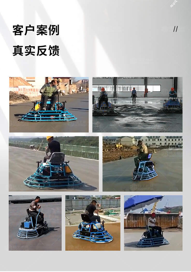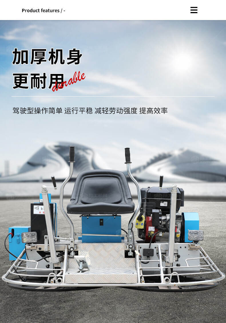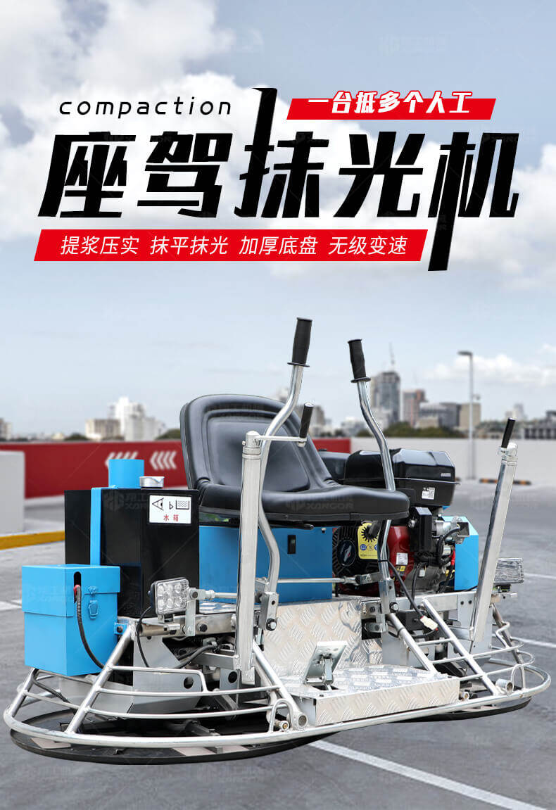 座駕式抹光機(jī)用于混凝土地面的提漿、壓實(shí)、抹平、抹光,座駕式操作大大降低了操作者勞動(dòng)強(qiáng)度,提高了作業(yè)效率。