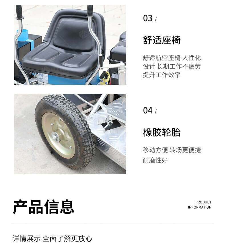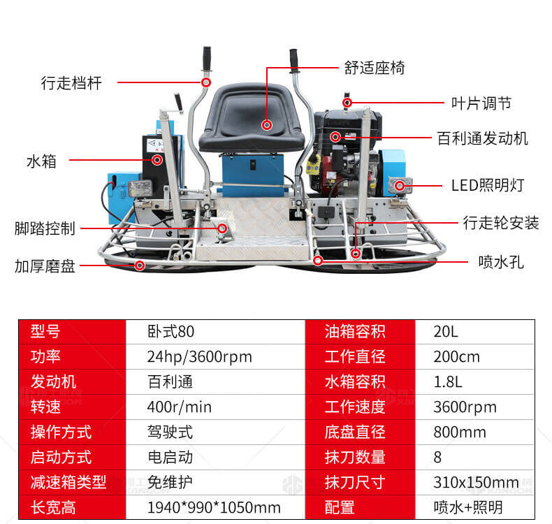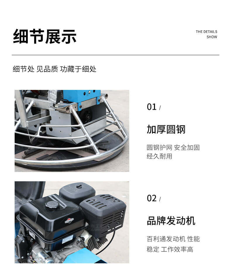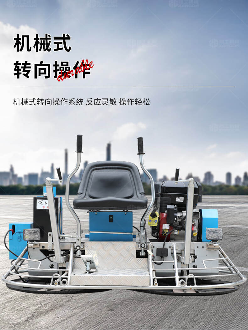 座駕式抹光機(jī)用于混凝土地面的提漿、壓實(shí)、抹平、抹光,座駕式操作大大降低了操作者勞動(dòng)強(qiáng)度,提高了作業(yè)效率。