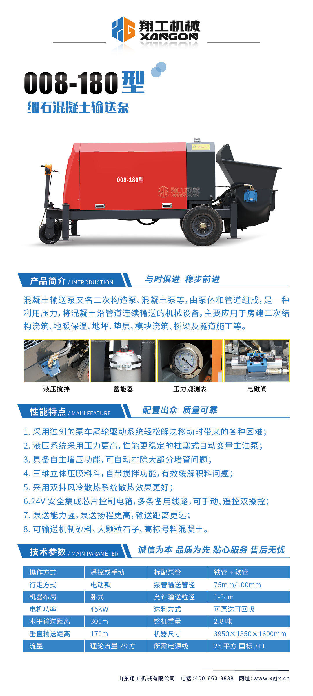 采用獨(dú)創(chuàng)的泵車尾輪驅(qū)動(dòng)系統(tǒng)輕松解決移動(dòng)時(shí)帶來的各種困難;采用雙排風(fēng)冷散熱系統(tǒng)散熱效果更好,液壓系統(tǒng)采用壓力更高,性能更穩(wěn)定的柱塞式自動(dòng)變量主油泵,采用先進(jìn)的三維立體壓模一體式自動(dòng)攪拌料斗可輸送機(jī)制砂,高標(biāo)號(hào)混凝土,有效緩解積料問題。