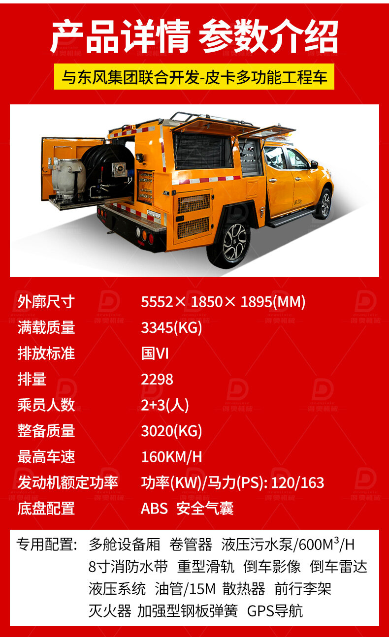 這是一款集皮卡越野能力與專業(yè)工程設備于一體的多功能特種車輛。它動力強勁,通過性極佳,能輕松應對復雜路況。后斗集成液壓系統(tǒng),可搭載液壓污水泵、液壓打樁機、電焊機等多種專業(yè)工具,是電力搶險、市政維修、工程作業(yè)等領域的移動工作站和得力助手。