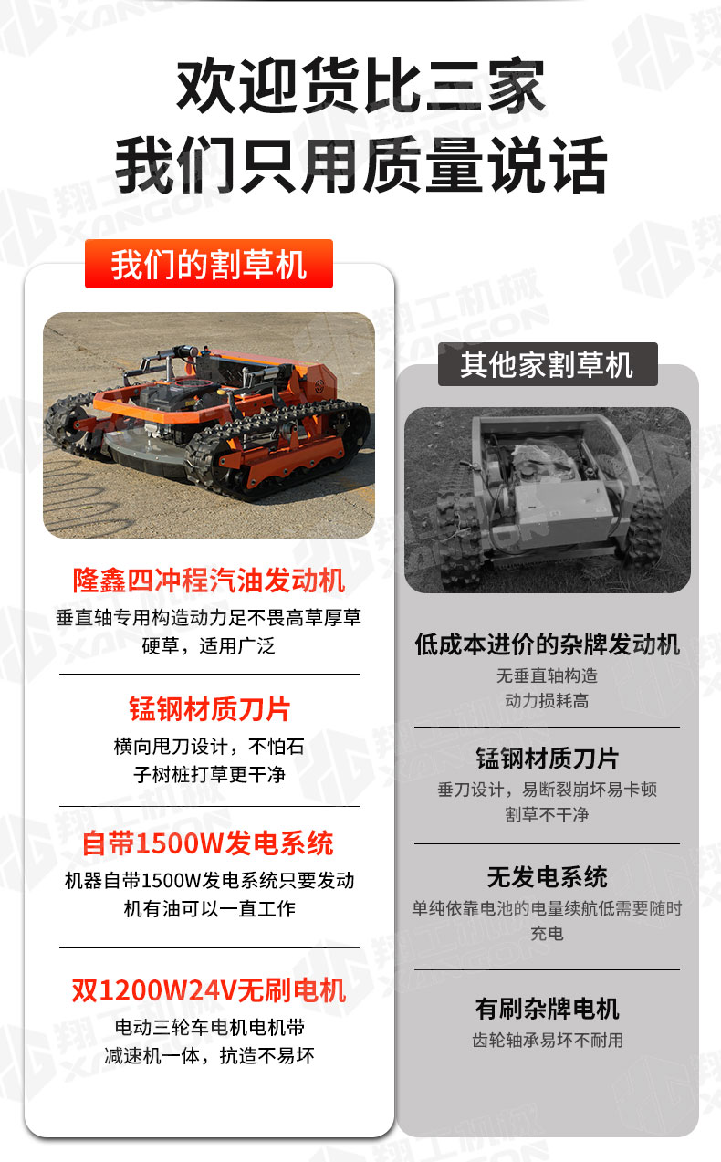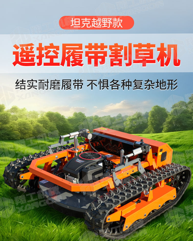 XG-1200是一款革新性的遙控坦克割草機(jī),專為復(fù)雜地形設(shè)計(jì)。其獨(dú)特的橡膠履帶底盤,具備卓越的越野與爬坡能力,輕松應(yīng)對(duì)陡坡、濕滑及不平整草坪。無(wú)線遙控操作,靈活精準(zhǔn),極大提升了割草效率與安全性,是果園、荒地及專業(yè)園藝工作的理想之選。